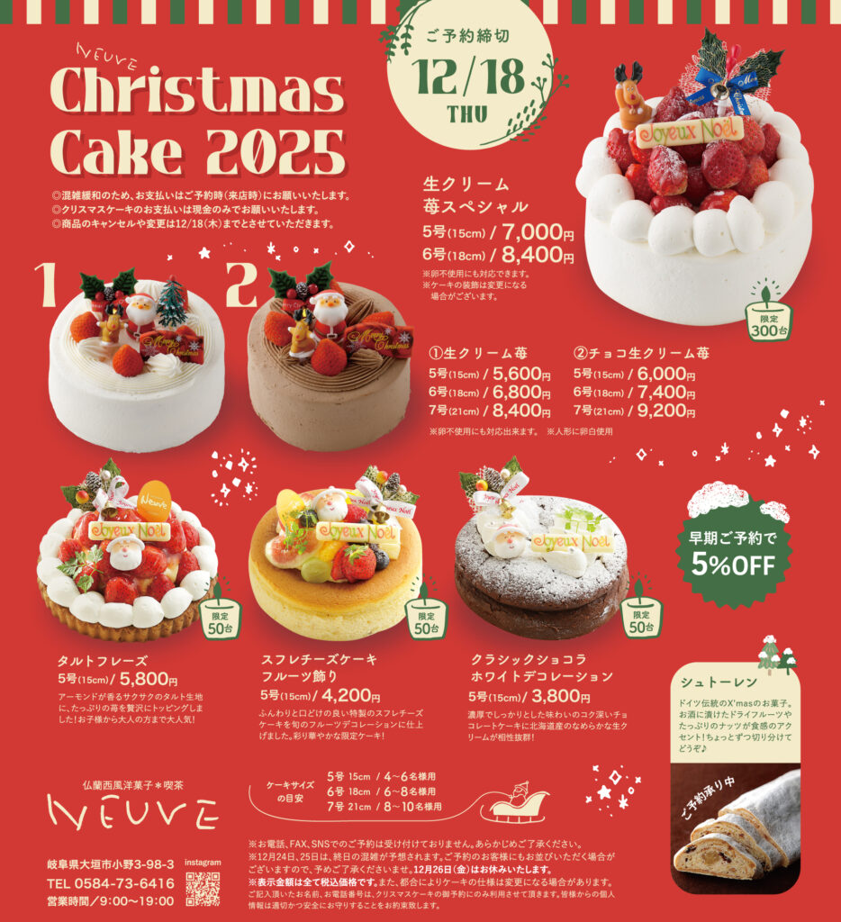 クリスマスケーキのご予約を開始いたしました。早期ご予約で5%OFF!ご予約締切は12/18(木)です。無くなり次第終了となりますので、ぜひお早めにご予約ください! ワクワク感や選ぶ楽しさを味わってもらえるよう多様多品種のケーキを常に取り揃えています。季節によって変わるスイーツもお楽しみに♪ プチガトー PETIT GATEAU PIERRE ピエール NOISETTINE ノアゼッティーヌ F・C・N F・C・N more アントルメ ENTREMETS TART ROUGE タルトルージュ DIABLO ディアブロ CHOCOLATE ROLL 生チョコロール more Instagram インスタグラム おはようございます☀️☀️ 『シュ こんにちは😊 今日はすっきりお天気 こんにちは😊 9月も残りわずか・・ Instagramでフォロー ACCESS アクセス 住 所〒503-0803 岐阜県大垣市小野3-98-3 TEL0584-73-6416 定休日不定休 時 間9:00~19:00(カフェはOS16:00) 席 数12席 駐車場25台 トップ プチガトー アントルメ ギフト Instagram