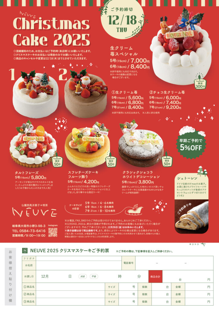 クリスマスケーキのご予約を開始致しました 今年もクリスマスケーキのご予約を開始いたしました。早期ご予約で5%OFF!ご予約締切は12/18(木)です。無くなり次第終了となりますので、ぜひお早めにご予約ください!